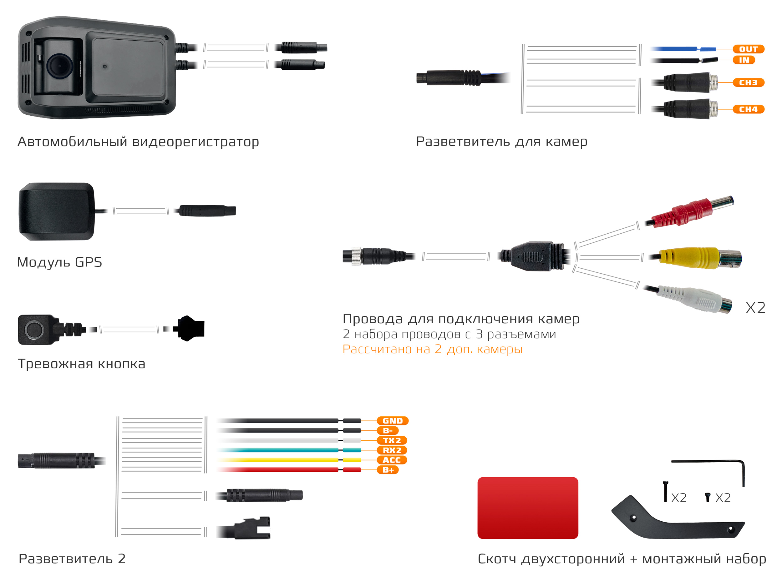 Видеорегистратор / Кабель питания / Камера / Кнопка SOS / GPS / Пластина / Лента |