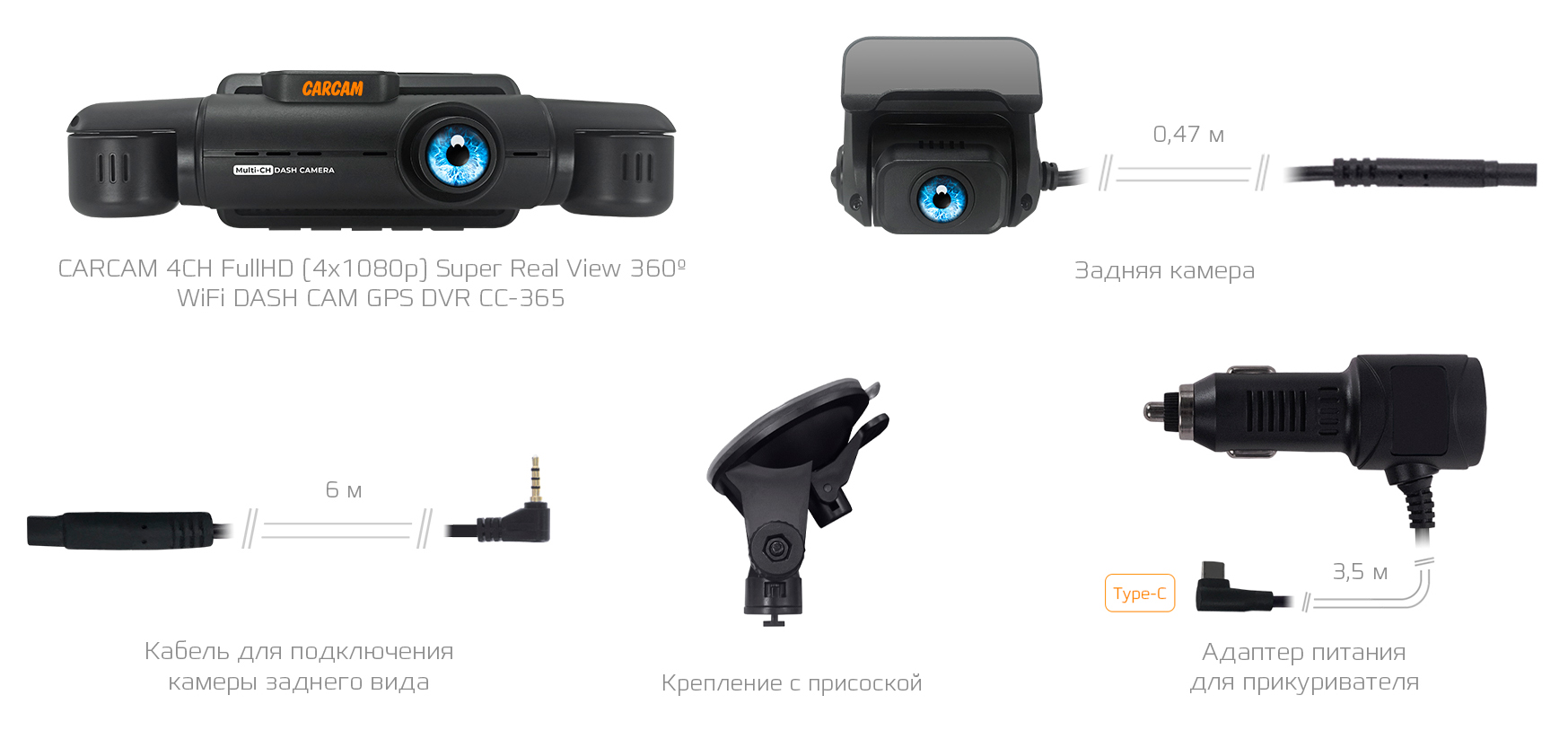 CARCAM 4CH FullHD (4x1080p) Super Real View 360º WiFi DASH CAM GPS DVR CC-365 — четырехканальный Full HD видеорегистратор. Угол обзора каждой камеры — 150°. Есть встроенный GPS модуль для штампа координат и скорости на записи. Боковые камеры поворачиваются на 180° по горизонтали и на 120° по вертикали и имеют незаметную подсветку из 4 ИК-светодиодов. Снимайте водителя, пассажиров, двери или обочины даже в абсолютной темноте. В комплект входит проводная парковочная камера. У видеорегистратора есть микрофон и динамик.