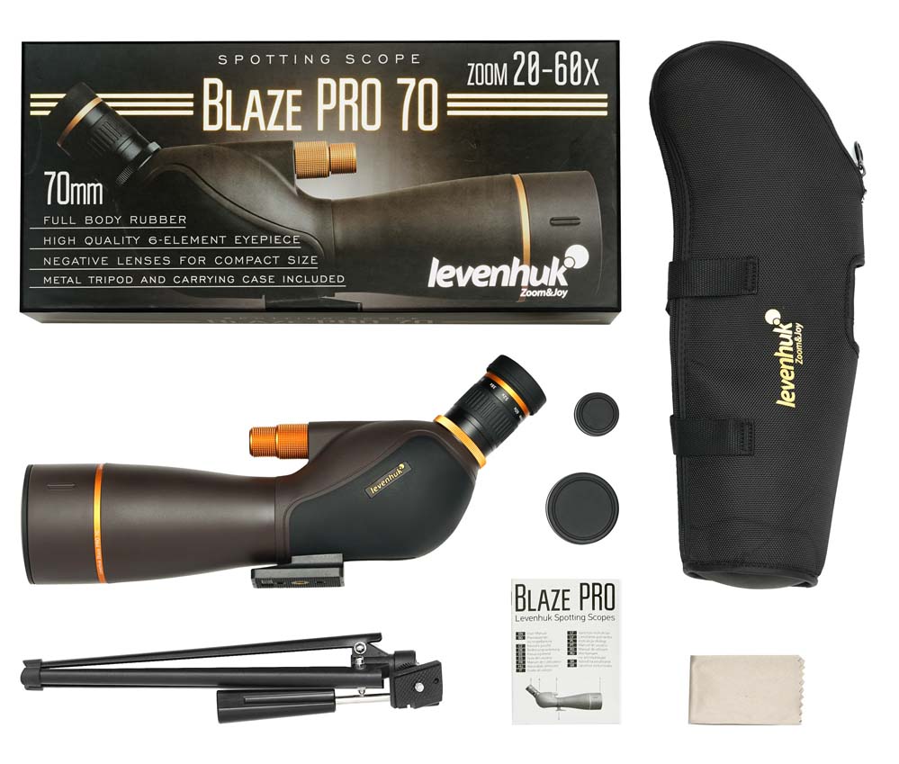 Levenhuk Blaze PRO 70 – зрительная труба, мощный и светосильный оптический прибор для изучения природных и городских ландшафтов. Она дает увеличение в диапазоне от 20 до 60 крат, собирает достаточно света для наблюдений в сумерках, не боится непогоды и случайных брызг воды. Эта зрительная труба станет прекрасным выбором для охотника, рыбака, орнитолога или натуралиста.