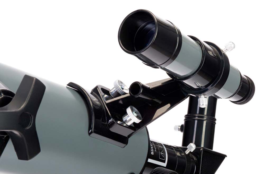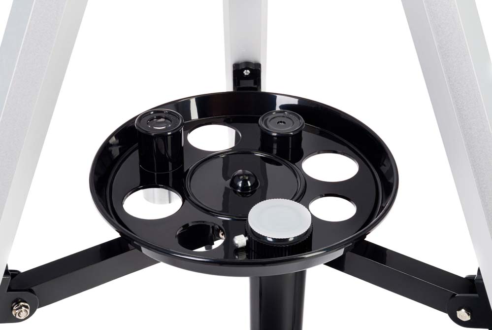 Все линзы оптической схемы сделаны из стекла и дополнены антибликовым покрытием, поэтому телескоп строит ясное и четкое изображение без искажений. Труба установлена на вилочную азимутальную монтировку, на вертикальной оси которой есть микровинт. Он используется для более удобного и точного наведения на объекты. Тренога сделана из алюминия и снабжена полочкой для аксессуаров. При необходимости высоту ножек треноги можно регулировать.Нельзя не сказать о комплектации. Она действительно впечатляет и избавляет от необходимости приобретать что-либо дополнительно. Здесь есть несколько окуляров для изучения космоса, окуляр для наземных наблюдений, линза Барлоу и диагональное зеркало. Это позволяет закрыть все потребности начинающего астронома.