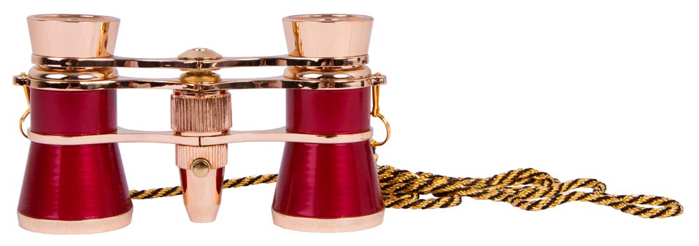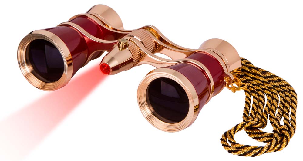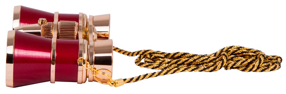 Говоря именно о данной модели Broadway 325F, следует в первую очередь упомянуть ее яркость – красный лаковый корпус с золотой отделкой точно не останется незамеченным. Несмотря на то, что корпус выполнен из металла, он отличается малым весом – около 200г. Такой миниатюрный бинокль легко поместится в театральной сумочке.Светодиодная подсветка выполняет функцию фонарика, помогающего безошибочно определить свое место в полутьме зрительного зала. Не менее полезна такая деталь, как цепочка – она не позволит потерять или забыть бинокль. К тому же, выполненная из черных и золотых деталей, она гармонично сочетается с корпусом.