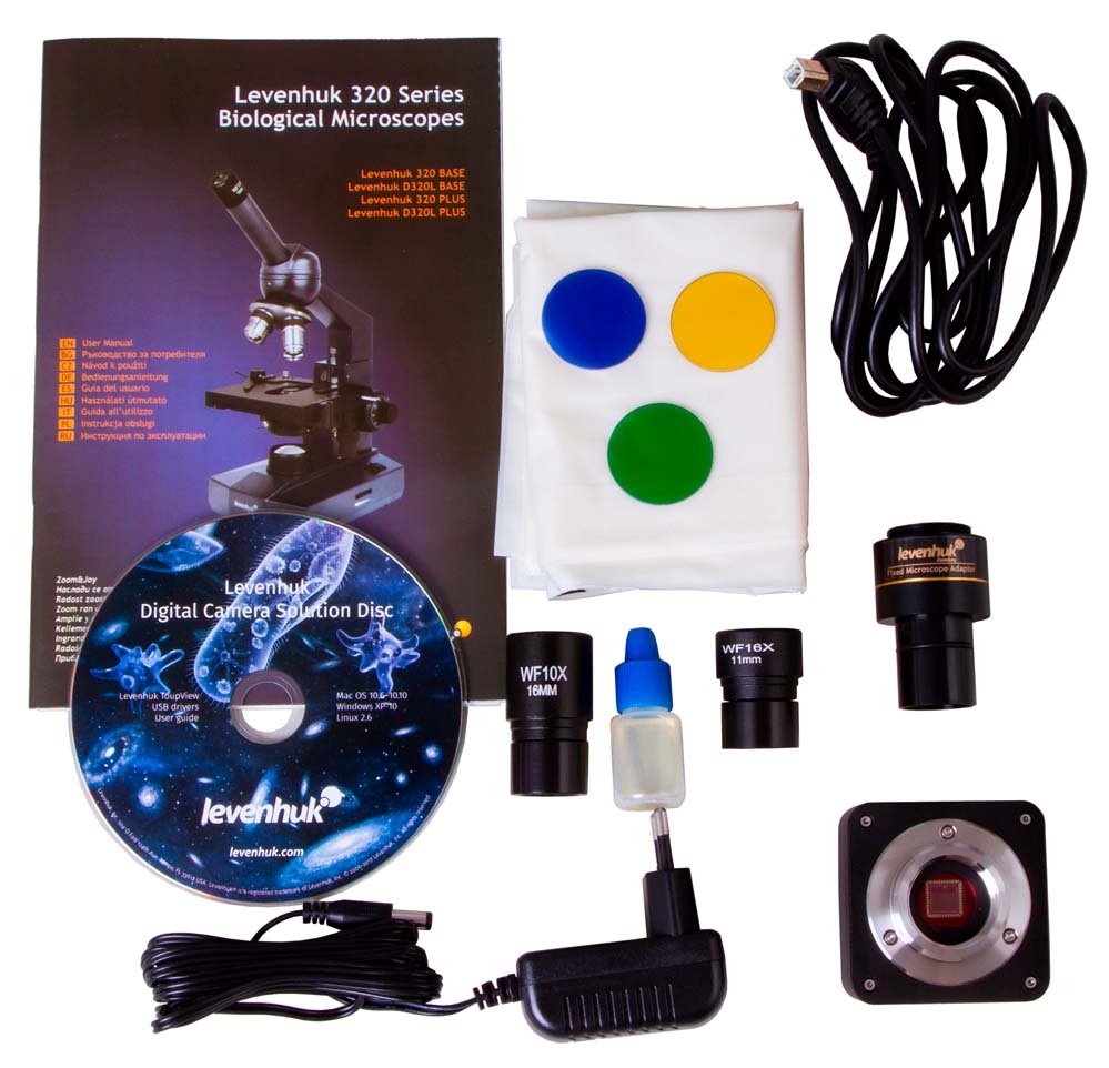 Основная особенность микроскопа – цифровая камера. Она устанавливается вместо штатного окуляра прямо в окулярную трубку. Для подключения к компьютеру используется комплектный USB-кабель. Камера передает картинку в режиме реального времени в разрешении до 2048х1536 пикс. С ее помощью можно делать отдельные фотоснимки или записывать видеоролики. Камера станет отличным решением для записи ключевых шагов исследований, создания презентаций или видеоуроков. Необходимое программное обеспечение включено в комплект поставки.