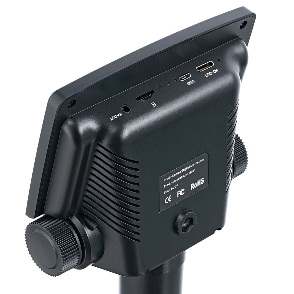Изображение с объектива выводится на встроенный ЖК-экран. Диагональ составляет 5 дюймов (12,7 см), передаваемая картинка цветная, с хорошим разрешением. Увеличение можно менять в пределах от 5 до 260 крат, диапазон оптического увеличения составляет от 5 до 15 крат. Через разъемы AV и HDMI изображение можно транслировать на внешние экраны, чтобы проводить презентации или демонстрировать образцы во время лекций.