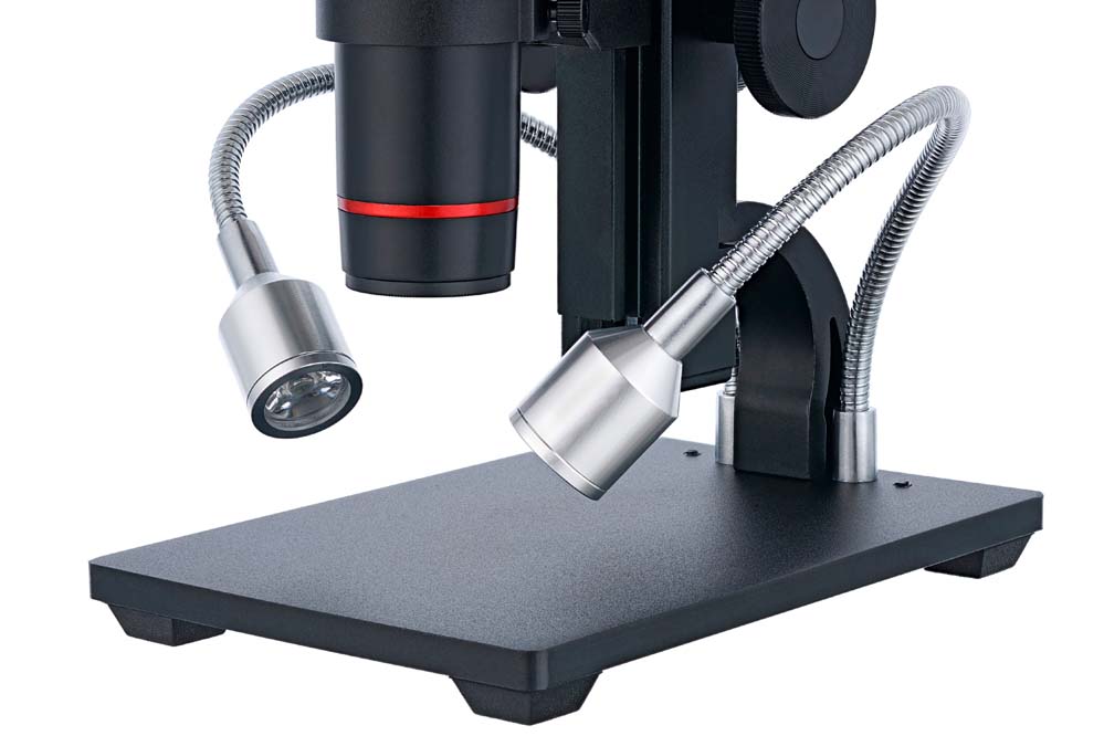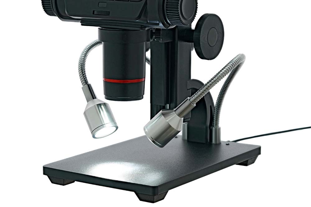 Подсветка размещена рядом с объективом. Она представляет собой два гибких держателя, на которых закреплены светодиоды. Держатели можно разворачивать под наиболее удобным для работы углом, тем самым создавая наиболее выигрышное для наблюдений освещение. Яркость подсветки можно регулировать. Для этого используется небольшой переключатель на кабеле питания. Там же расположена и кнопка включения/выключения микроскопа.