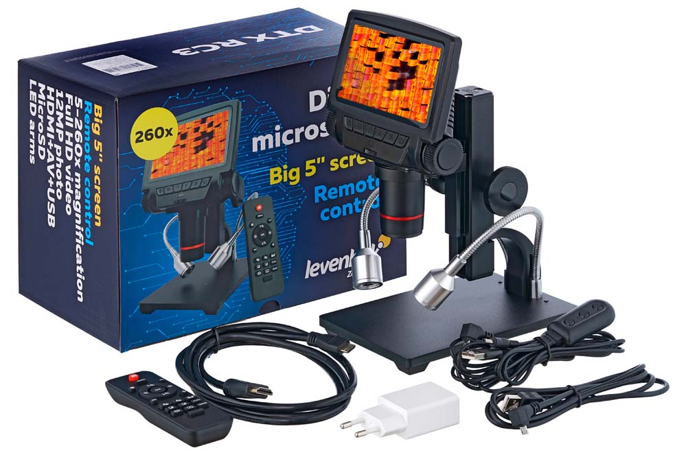 Levenhuk DTX RC3 – микроскоп с дистанционным управлением, который можно использовать не только для наблюдений, но и для измерений образцов. Также микроскоп пригодится для проведения презентаций, так как его можно подключать к внешним экранам: телевизору или монитору. И не стоит забывать про дистанционное управление – беспроводной пульт дает доступ к большинству функций прибора, что делает работу с ним еще более удобной. Возможности микроскопа оценят ювелиры, мастера по ремонту техники и электроники.