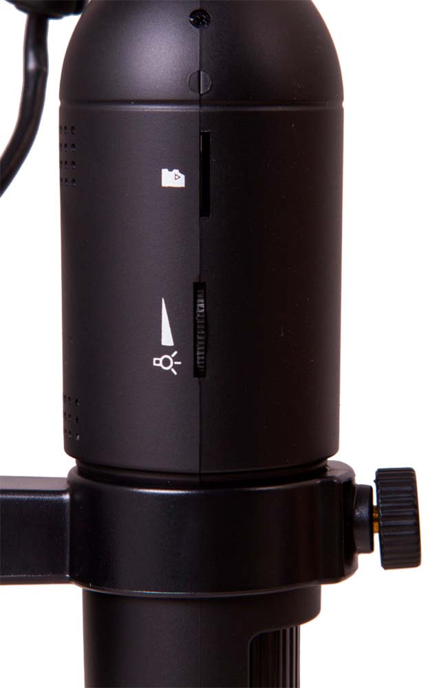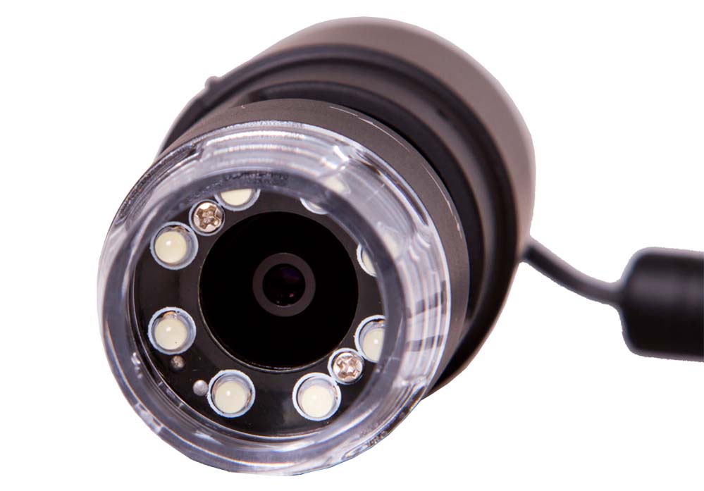 Для работы в условиях плохой освещенности микроскоп снабжен светодиодной подсветкой. Для ее питания не требуется батарейки – зарядка микроскопа идет через USB-кабель или сетевой адаптер прямо во время работы.