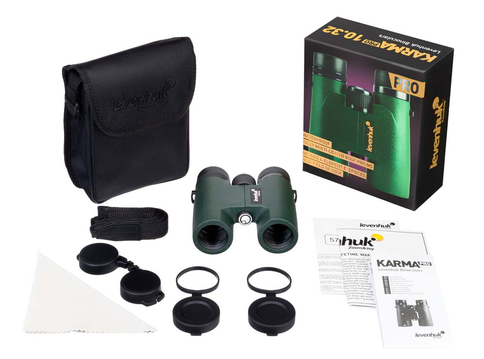 Roof-призмы, на которых построен бинокль, позволили добиться максимальной компактности корпуса. Усовершенствованная конструкция окуляров позволяет получить максимально четкое и резкое изображение. Линзы с полным многослойным просветлением обеспечивают точную передачу цветов. Чтобы оптика не запотевала, корпус наполнен азотом. Даже при плохой погоде бинокль Levenhuk Karma PRO 10x32 дает чистую и яркую картинку.При создании бинокля большое внимание уделялось эргономичности: корпус с нескользящим резиновым покрытием защитного цвета удобно ложится в руки. Бинокль можно подстроить под особенности каждого пользователя – для этого можно поменять межзрачковое расстояние, настроить диоптрии, подобрать оптимальное расстояние от глаз до линз окуляров. Levenhuk Karma PRO 8x32 полностью водонепроницаем.
