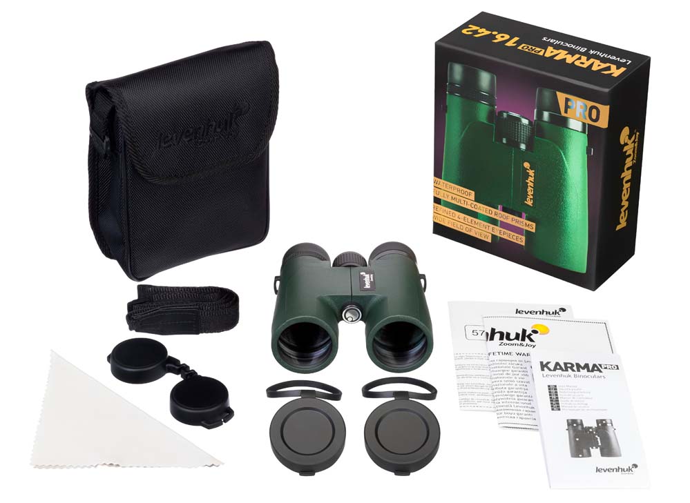 Оптическая схема построена на roof-призмах – это позволило при достаточно больших объективах сделать бинокль компактным. Важная особенность биноклей этой серии - четырехэлементная конструкция окуляров: она гарантирует передачу картинки максимального качества. Дополнительно на линзы нанесено полное просветляющее покрытие, которое повышает светопропускание. Чтобы оптика не запотевала, корпус бинокля наполнен азотом. Levenhuk Karma PRO 16x42 дает яркое, чистое, «живое» изображение с точной передачей цветов в любых условиях!Бинокль Levenhuk Karma PRO 16x42 легко подстроить под особенности каждого пользователя: межзрачковое расстояние регулируется, на правом окуляре есть кольцо настройки диоптрий. Чтобы бинокль не скользил в руках, корпус покрыт рельефной резиновой оболочкой защитного цвета. Levenhuk Karma PRO 16x42 не боится воды, и его можно использовать в любую погоду.