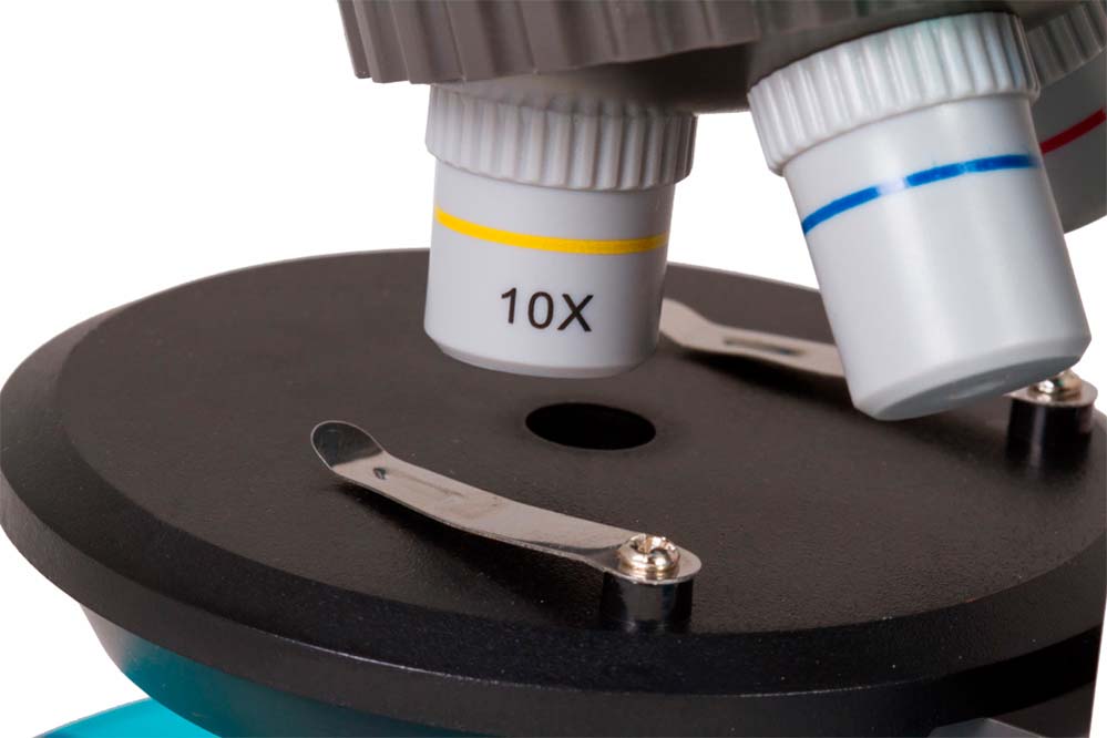 Levenhuk LabZZ M101 Azure\Лазурь – это детский микроскоп с качественной оптикой, как у серьезных «взрослых» моделей. Микроскоп снабжен тремя объективами: 4x, 10x и 40x. Для смены объектива нужно просто повернуть револьверное устройство. В комплект входит выдвижной окуляр с двумя увеличениями (10 и 16 крат) – это гораздо удобнее, чем два обычных окуляра. Ребенку не придется менять окуляры, и он не потеряет их. Микроскоп имеет шесть степеней увеличения – 40, 64, 100, 160, 400 и 640 крат.