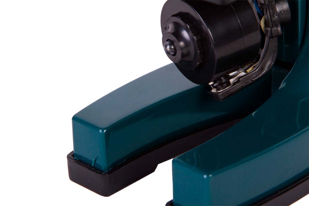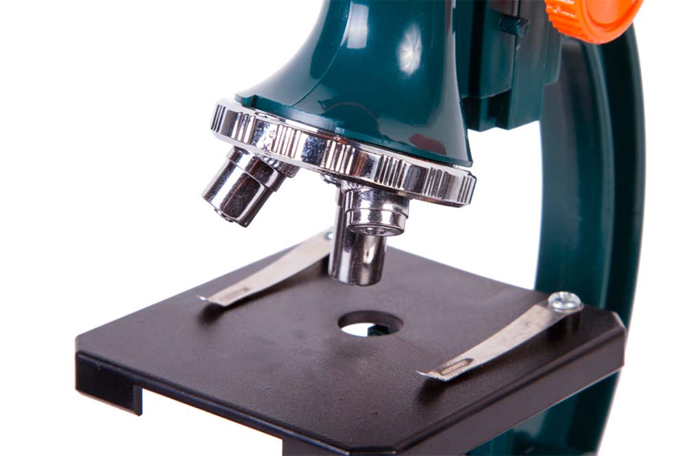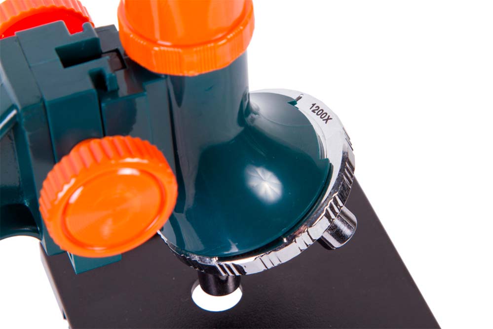 Levenhuk LabZZ M3 имеет большой диапазон увеличений: от 300 до 1200 крат. Выбрать нужную кратность можно поворотом револьверного устройства. Фокусировка грубая, для ее настройки используется отдельная ручка. Предметный столик с металлическими зажимами может перемещаться по вертикали. Подсветка микроскопа расположена под предметным столиком. Она работает от батареек (нет в комплекте), а при хорошем внешнем освещении можно использовать зеркало.