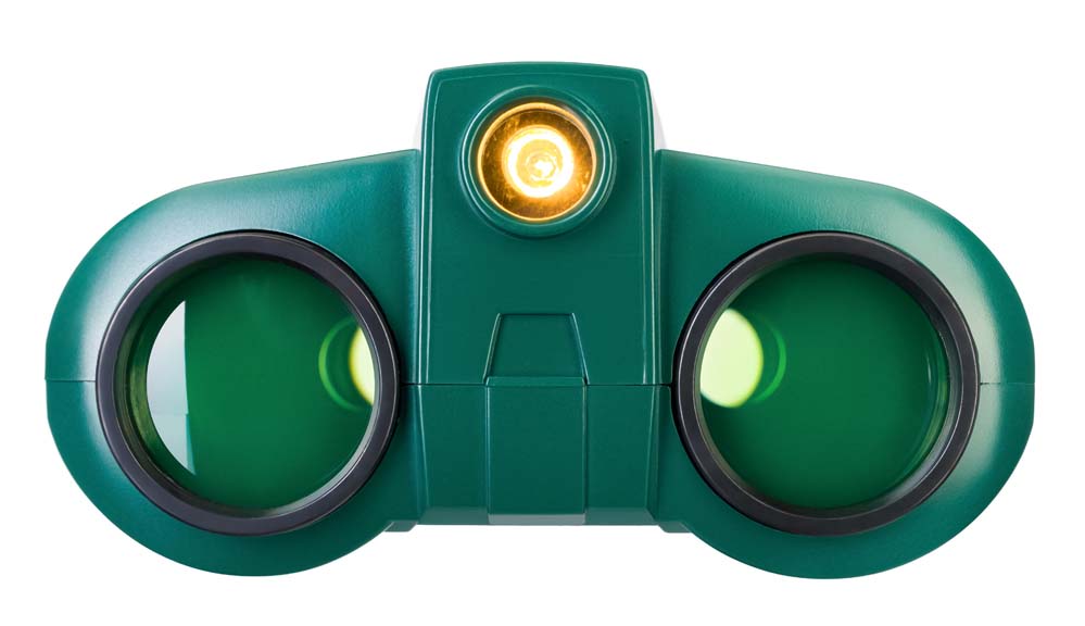 Levenhuk LabZZ NV5 – бинокль ночного видения, детский оптический прибор, которым можно пользоваться даже в темное время суток. Это становится возможным благодаря встроенному выдвижному фонарю, работающему от батареек. Под фонарем расположена цветная линза, окрашивающая картинку в зеленоватый оттенок – прямо как в настоящих приборах ночного видения, которые используются взрослыми на охоте. Бинокль отлично проявит себя в туристическом походе на несколько дней или семейном путешествии. На 4-кратном увеличении ребенок сможет рассмотреть множество интересных деталей – в городе и на природе, при свете дня и в темноте.