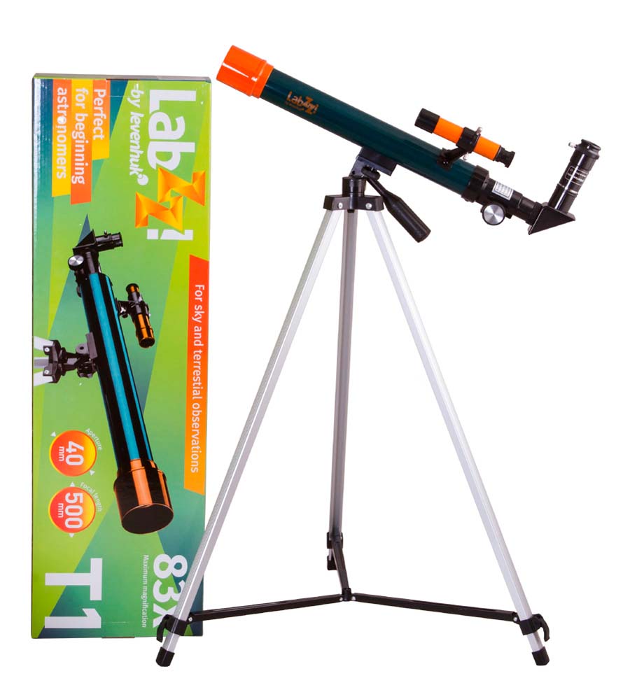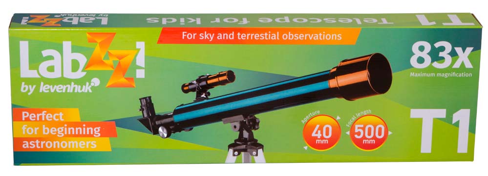 Levenhuk LabZZ T1 – телескоп, который можно порекомендовать в качестве первого телескопа для любознательного ребенка. Это рефрактор с высококачественной оптикой, который дает возможность изучить лунную поверхность, увидеть марсианские кратеры или вихри на Венере. Благодаря наличию в комплекте поставки диагонального зеркала, которое правильно ориентирует изображение, телескоп можно использовать как зрительную трубу для наблюдения наземных объектов.