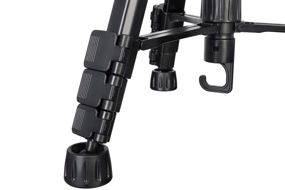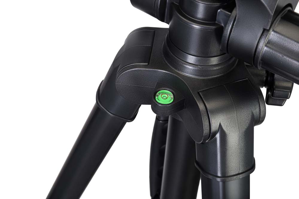 Высоту штатива можно регулировать в широком диапазоне: от 460 до 1760 мм. Можно выдвинуть или задвинуть ножки, закрепив их в нужном положении быстрозажимными флип-замками. Также отдельной ручкой можно поднять или опустить центральную штангу. При установке штанги в самое высокое положение рекомендуется повесить на центральный крюк утяжелитель – это повысит устойчивость штатива. Чтобы установить штатив максимально ровно относительно горизонта, используйте встроенный пузырьковый уровень.