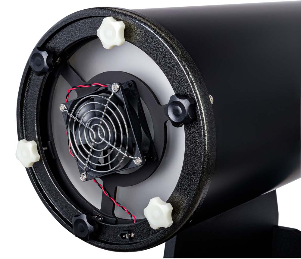 Одной из особенностей этого телескопа является активное охлаждение главного зеркала, которое работает от батареек (приобретаются отдельно). Оно ускоряет термостабилизацию оптики, т. е. позволяет быстрее приступить к наблюдениям, если телескоп был вынесен из теплого помещения на холодную улицу. Без охлаждения обычно приходится ждать несколько часов, чтобы зеркало «остыло», вентилятор же убыстряет этот процесс примерно вдвое.