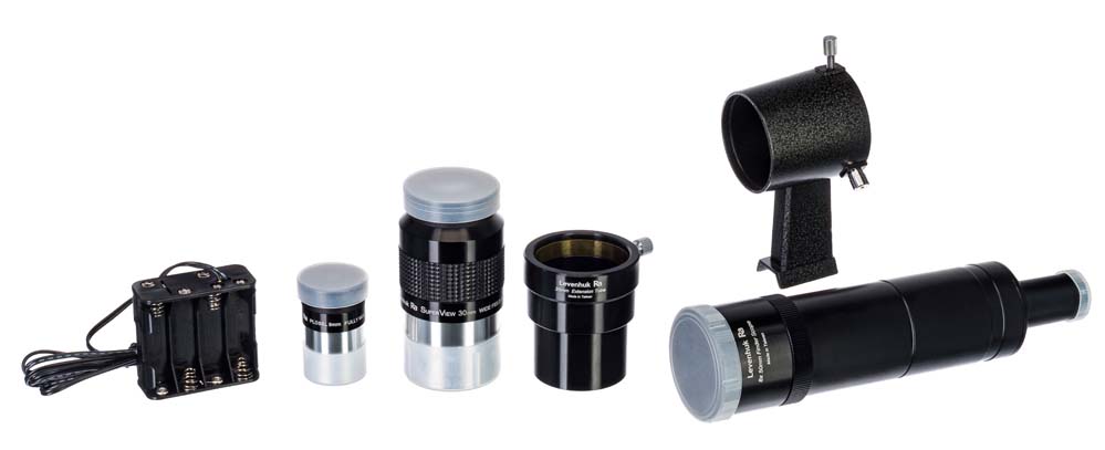 В комплектацию телескопа включены базовые оптические аксессуары, которые позволят сразу же приступить к наблюдениям. Это два окуляра с разными фокусными расстояниями и оптический искатель 8x50 мм.