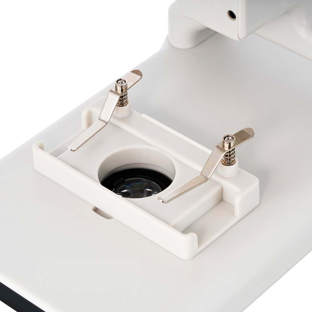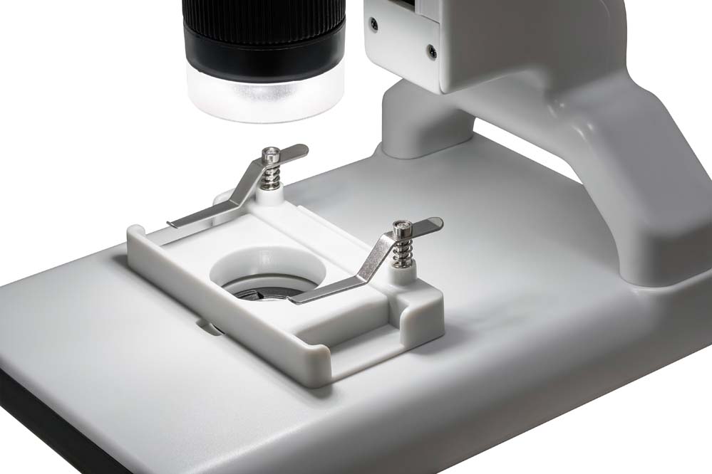 Прибор обеспечивает увеличение в диапазоне от 7 до 200 крат, картинка выводится на встроенный ЖК-экран с диагональю 5 дюймов (12,7 см). Экран передает цветное изображение и может быть отклонен на небольшой угол для более удобной работы. Кнопки управления микроскопом находятся прямо под экраном, но в комплекте есть также и беспроводной пульт дистанционного управления. На него вынесены не все функции, но с его помощью можно запускать запись видео, фотографировать и регулировать увеличение.Микропрепараты на предметном столике закрепляются зажимами. Для освещения используются верхняя и нижняя светодиодная подсветки с регулировкой яркости. Подсветка может работать от аккумулятора, что делает прибор более мобильным.