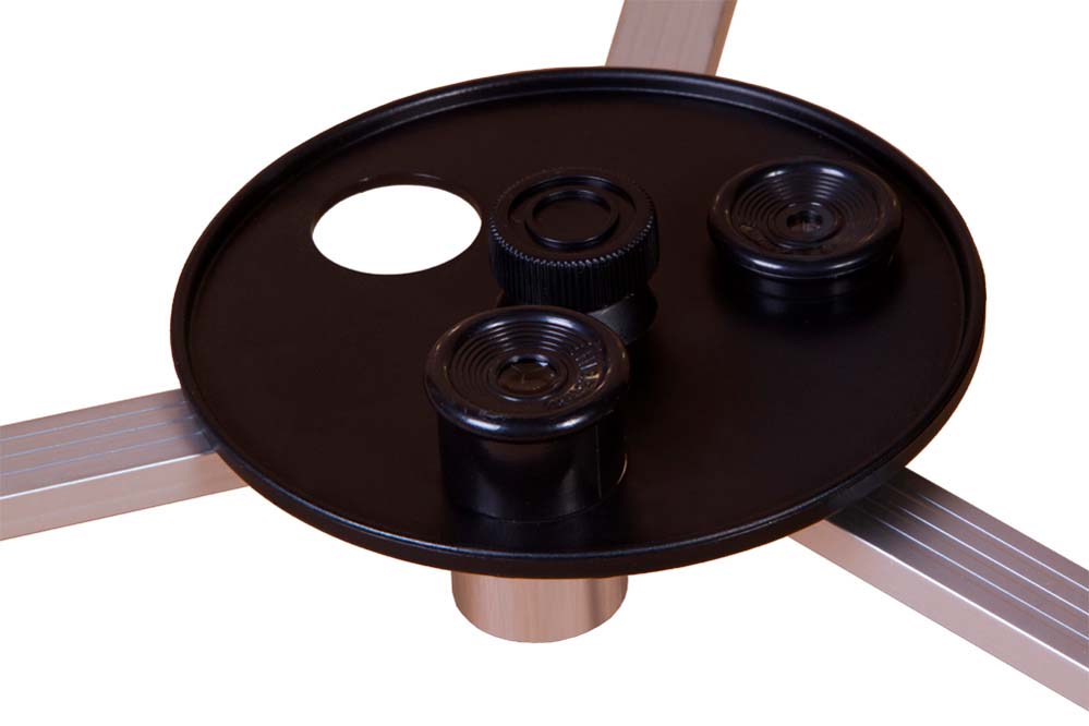 Устойчивость телескопу придает алюминиевая тренога с ножками регулируемой высоты. Каждую опору можно настроить индивидуально, поэтому Levenhuk Skyline BASE 50T прочно стоит даже на неровных поверхностях. На треногу устанавливается лоток для аксессуаров, на котором удобно хранить дополнительные окуляры, карты звездного неба, компас и прочее.