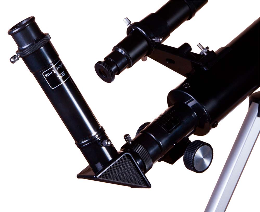 Оптика рефрактора сделана из полностью просветленного стекла – это улучшает четкость и контрастность картинки. В комплект поставки включено несколько окуляров. Меняя их, можно выбирать подходящее увеличение для наблюдений – большее или меньшее. Диагональное зеркало, тоже входящее в комплект поставки, используется для наземных наблюдений. Как и все телескопы Levenhuk Skyline BASE 50T переворачивает картинку вверх ногами, а диагональное зеркало возвращает ее к привычному виду.
