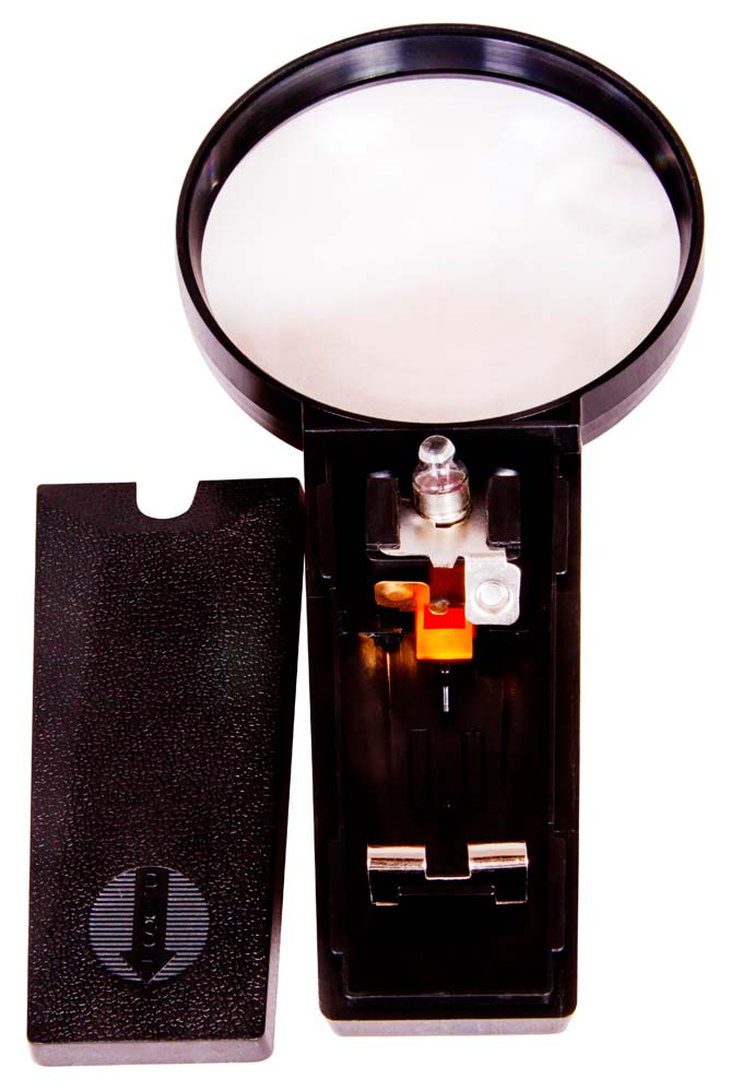 Диаметр лупы составляет 90 мм, доступны два увеличения – 2 и 6 крат. Все элементы оптики и корпуса сделаны из пластика. Для работы подсветки требуются батарейки (нет в комплекте).