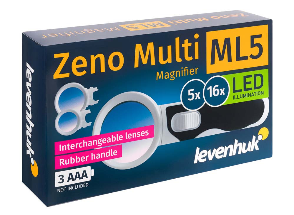 Levenhuk Zeno Multi ML5 – мультилупа, идеальный оптический инструмент для чтения и изучения мелких объектов. Это лупа на ручке, комплектующаяся двумя сменными линзами. Линзы различаются диаметром и увеличением. Менять их можно прямо во время наблюдений – каждая линза снабжена простым, но надежным креплением. В ручку встроена подсветка – два ярких светодиода. Лампочки дают равномерное освещение рабочей области, поэтому лупа прекрасно подходит для работы даже в полной темноте.