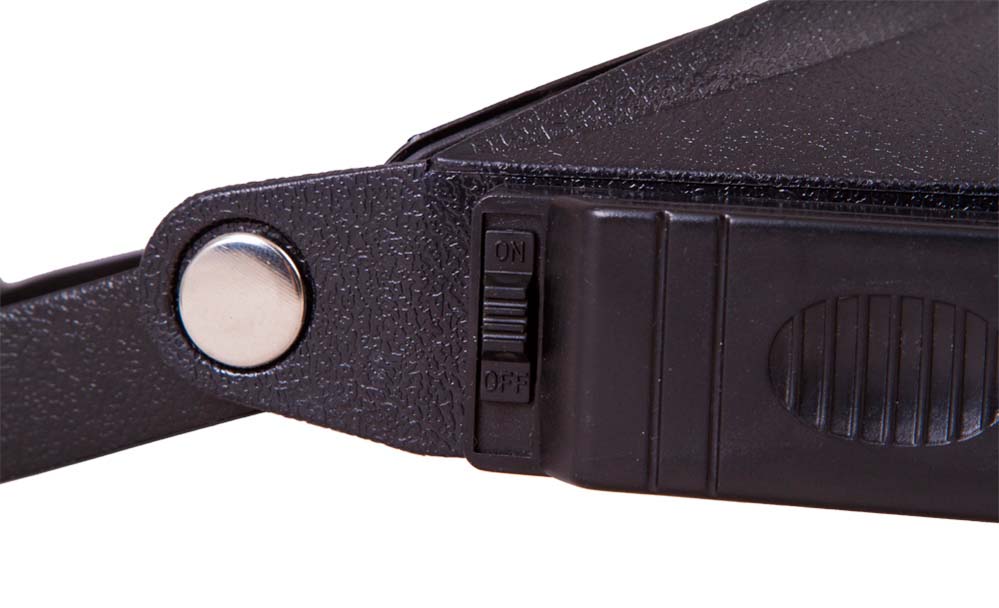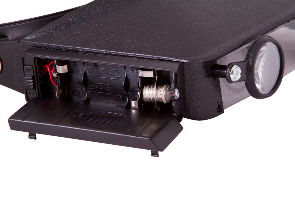 Лупу можно закрепить на голове при помощи специального гибкого фиксатора с липучкой. Ваши руки будут свободными, и вы сможете выполнять любые работы с мелкими предметами. Для удобства лупа снабжена подсветкой – двумя яркими лампочками, размещенными по бокам от линзы. Интенсивности освещения хватит для работы даже в полностью темном помещении. Подсветка работает от батареек типа ААА (нет в комплекте).