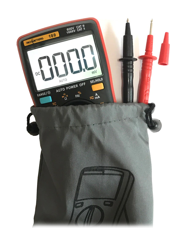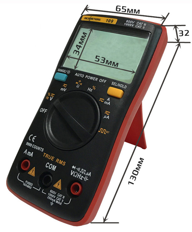 RichMeters RM109 Цифровой мультиметр – это обновление линейки качественных и недорогих измерительных приборов. Цифровой мультиметр RM-109 основан на модификации чипа DTM0660, имеет минимальные пределы измерения 1мкВ, 10нА, 0.01Ω и встроенный простой генератор прямоугольных импульсов 50Гц – 5КГц. Этот прибор продолжает линейку портативных цифровых мультиметров с автоматическим выбором пределов, имеет защиту от перегрузки и хорошие метрологические характеристики. В комплекте с прибором идут качественные щупы, удобный чехол для защиты прибора от повреждений и загрязнений. Экран прибора имеет яркую подсветку. Очень важно, что прибор питается от двух пальчиковых батареек, а не от 9-вольтовой батареи.