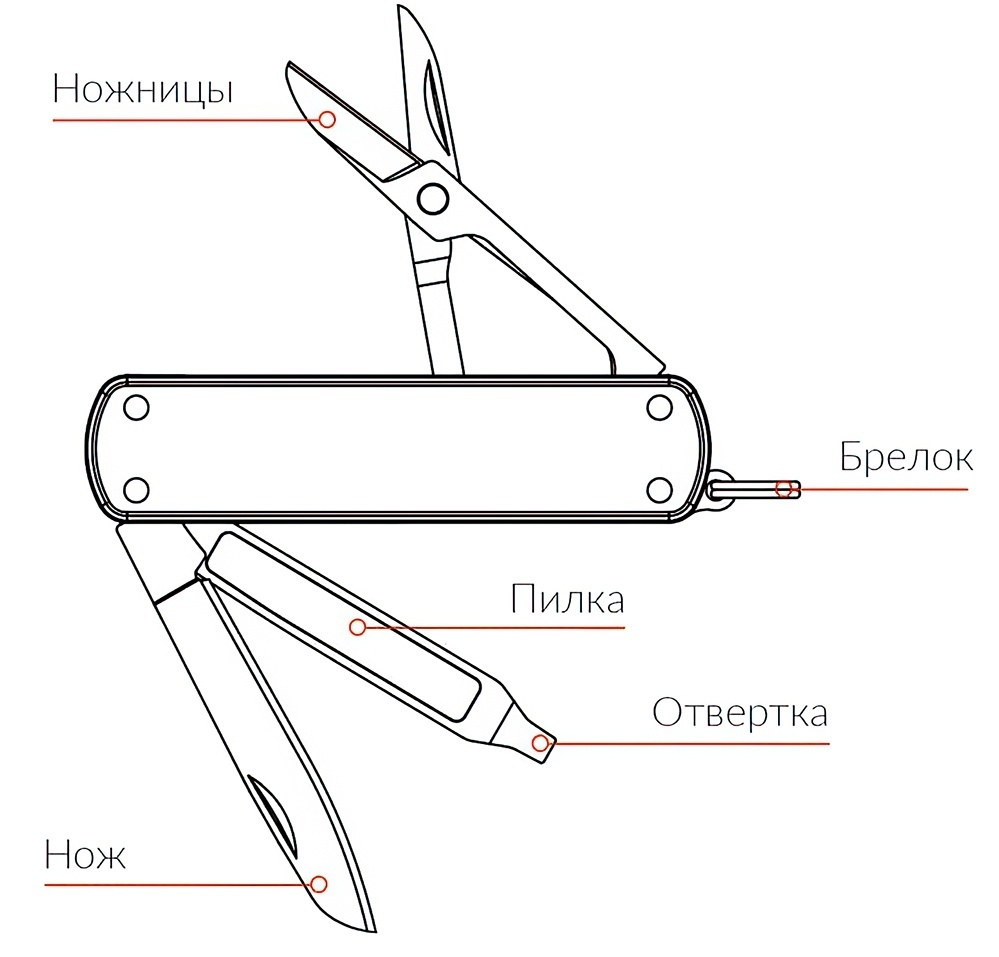 Включает в себя: нож, ножнички, отвертка, пилка, брелок