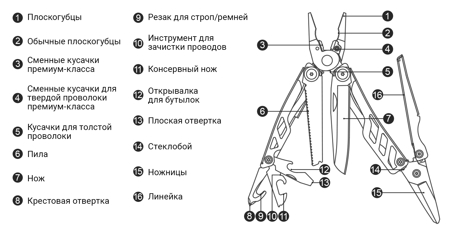 Xiaomi NexTorch Multifunctional Plier 16 in 1 (MT10) Black – это мультитул, способный заменить сразу 16 инструментов. Он включает в себя такие инструменты как спасательные ножницы; кусачки, стеклобой, резак для строп и ремней, плоскогубцы, ключ для кислородного баллона, отвертки, нож, универсальная пила, линейка, открывалка для бутылок и зажим для пояса.